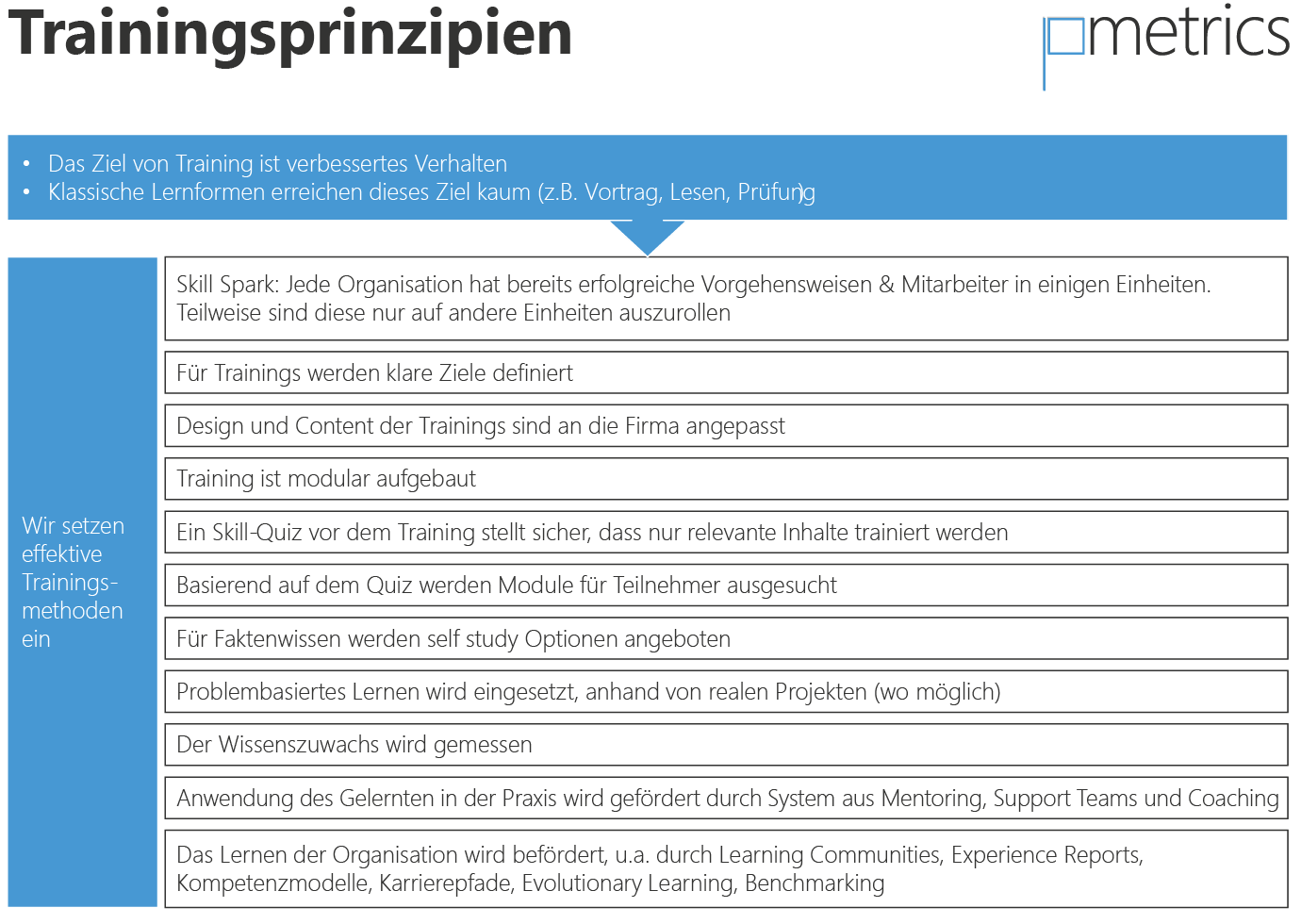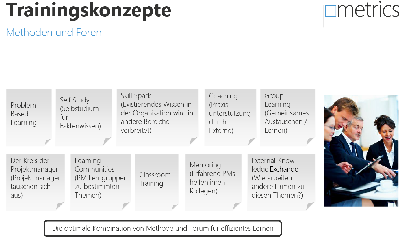 Unser zentrales Ziel für die Trainings ist, dass die Teilnehmer neue Methoden und Verfahren einsetzen, wenn Sie in ihrem täglichen Umfeld sind und dadurch den Erfolg ihrer Projekte verbessern.