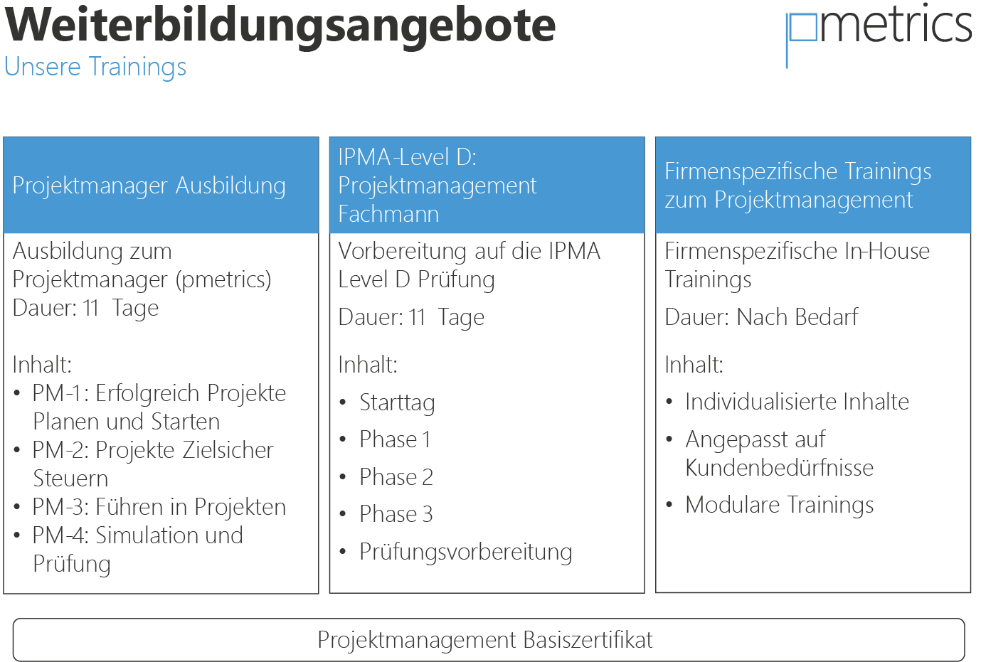 Wir trainieren Ihre Mitarbeiter, damit sie in Zukunft noch erfolgreicher Projekte durchführen können, und bieten ein umfassendes Weiterbildungskonzept.
